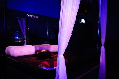 Naast de dansvloer heb je een aantal zit/lig hoeken met matrassen en kussens waar je kunt relaxen of juist iets spannends doen. In de hoek staat er een kooi met een groot bed erin.